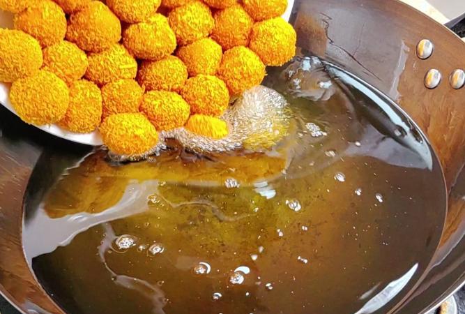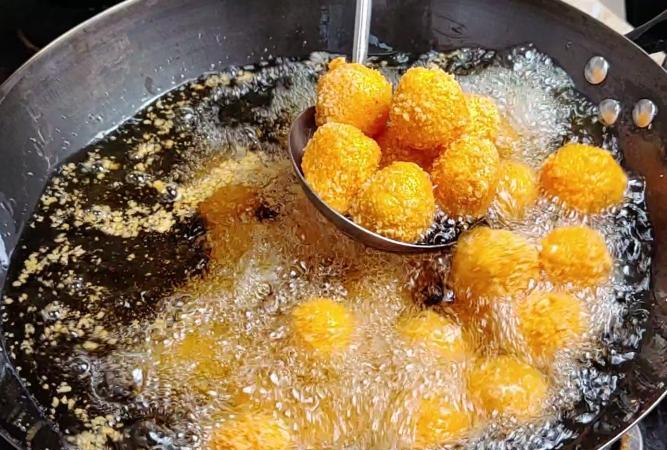 2、炸湯圓要想不炸裂,不露餡,那麼對油溫和炸制的時間很重要,因為湯圓是已經煮熟了的,我們只要把外表的麵包糠炸到酥脆就可以,所以根本不需要去考慮湯圓有沒有熟的問題。