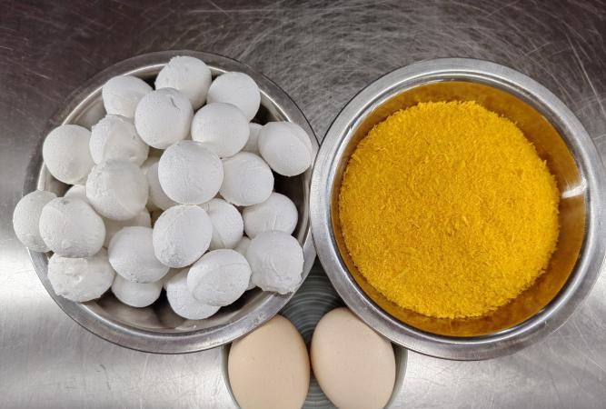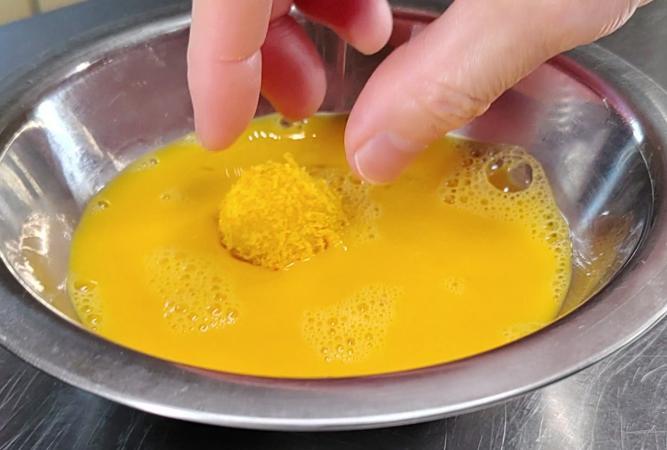 4、接著把裹了麵包糠的湯圓放雞蛋液中滾上幾圈,讓裹了麵包糠的湯圓均勻地裹上一層蛋液,這樣等於又給湯圓上了一層外殼。
